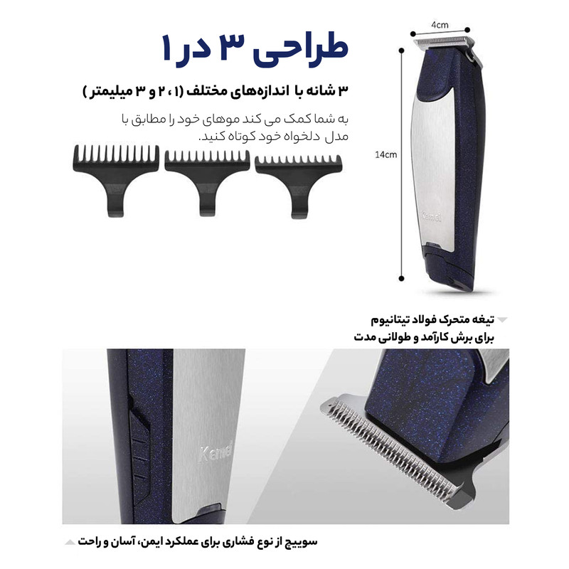 ماشین اصلاح مدل km-5021 ساخت شرکت کیمی، تیغه های این ماشین اصلاح از استیل ضد زنگ ساخته شده است که در مقابل هوا و رطوبت از مقاومت خیلی بالایی برخودار است. تکنولوژی برش این ماشین اصلاح بصورت مستقیم می باشد و به راحتی موها را با مرزبندی مشخصی کوتاه می کند. سری اصلی این ماشین اصلاح موهای سر وصورت را از 0.5 تا 2.5 سانتی متر واسه ی شما کوتاه می کند. به همراه این ماشین اصلاح سه عدد شانه ارایه شده است و می توان از آن ها برای کوتاه کردن مو و سایه انداختن استفاده کرد. باتری ماشین اصلاح کیمی مدل km-5021 در مدت 8 ساعت بطور کامل شارژ می شود بعد از شارژ کامل دستگاه می توان از آن به مدت 60 دقیقه پیوسته استفاده کرد. همچنین به همراه این ماشین اصلاح روغن و برس ارایه شده است تا شما بتوانید پس از هر بار اصلاح تیغه را به خوبی تمیز و مرتب کرد
