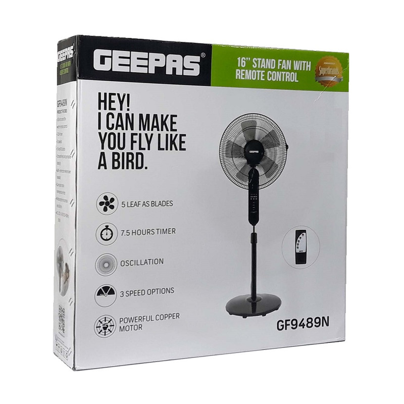 برند جیپاس GEEPAS یکی از عرضه کنندگان لوازم خانگی و برقی است که با بیش از 36 سال تجربه ، در اغلب قاره ها اعم از آسیا و اروپا و آمریکا از استقبال بسیار خوبی برخوردار بوده است.پنکه ایستاده جیپاس مدل GF9489N از انواع پنکه های ایستاده این شرکت است که کیفیت بسیار مناسبی دارد .از مزایای این پنکه دارا بودن حالت های متنوع عملکرد می باشد که مناسب برای زمان استراحت و در شب و یا در شرایط عادی بوده و با فشردن دکمه MODE با قراردادن در وضعیت استراحت در شب ، پنکه بطور خودکار، تغییراتی متناوب در سرعت ایجاد می کند یعنی در مدت چند ثانیه با سرعت بالا کار می کند و بعد از آن برای چند ثانیه سرعت بسیار کاهش پیدا می کند و این عملکرد بطور مکرر انجام می شود که سبب افزایش کیفیت خواب کاربر می شود . این دستگاه پنکه از تایمر با زمان بندی 0.5 تا 7.5 ساعت بهره می برد که نحوه تنظیم آن بسیار مبتکرانه از سوی تولید کننده طراحی شده است با یک بار فشردن دکمه تایمر LED مربوط به نیم ساعت روشن می شود و با فشردن بار دوم این زمان بعلاوه نیم ساعت شده و چراغ 1 ساعت روشن می شود و در فشردن برای سومین بار چراغ 1 ساعت و نیم ساعت روشن می شود و تایم روی 1.5 ساعت قرار می گیرد و به همین ترتیب تا 7.5 ساعت با فواصل نیم ساعته قابل تنظیم است.کلیه کارکردهای پنکه با ریموت آن قابل کنترل است . میله وسط از جنس استیل بوده و از استحکام بالایی برخوردار است و باعث می شود ارتفاع پنکه را بتوان با یک پیچ در پشت آن به 133 سانتیمتر رساند .