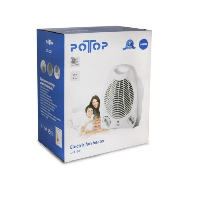 بخاری برقی فن دار مدل LQ-501 دو منظوره پات تاپ با توان حرارتی متغیر 1000 وات تا 2000 وات وسیلهای کارآمد با طراحی زیبا، کاربری آسان و بازده حرارتی مناسب است. (این دستگاه به مجهز به فن برای جابجایی گرما است همچنین در تابستان از این وسیله به عنوان پنکه رو میزی هم میشود استفاده کرد .) LQ-501 در فصل سرد فضایی دلپذیر در خانه یا محل کار ایجاد میکند. در مکانهای بسته نیز میتوانید بدون نگرانی از کاهش اکسیژن محیط، گرمای مطلوب داشته باشید. این محصول مجهز به ترموستات است که توسط آن میتوان میزان حرارت دلخواه را تنظیم کرد. به کمک کلید گردان نیز میتوان روشن و خاموش کرد. برای بازدهی یشتر از صفحه استیل منعکس کننده فن و حرارت در پس زمینه المنتها استفاده شده است. فن هیتر پوتوپ مدل Potop lq-501 کارکردی بسیار کمصدا دارد و با حداکثر توان 2000 وات کار میکند. روی بدنه دستگاه 2 دکمه ولومی دیده میشود که که یکی برای کنترل دما و دیگری برای کنترل میزان توان باد تعبیه شده است.